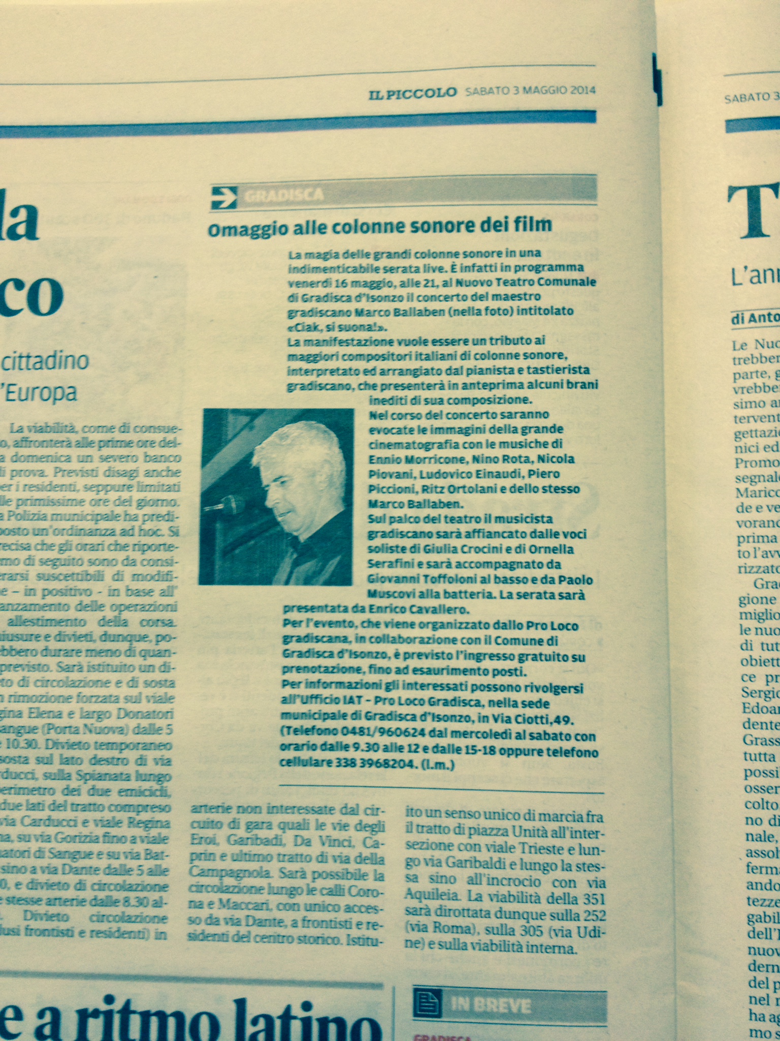 È uno spettacolo/concerto dedicato ai maggiori compositori italiani di colonne sonore, quali Ennio Morricone, Nino Rota, Nicola Piovani, Piero Piccioni, Ludovico Einaudi. In quell’occasione ho presentato per la prima volta alcuni brani di mia composizione.